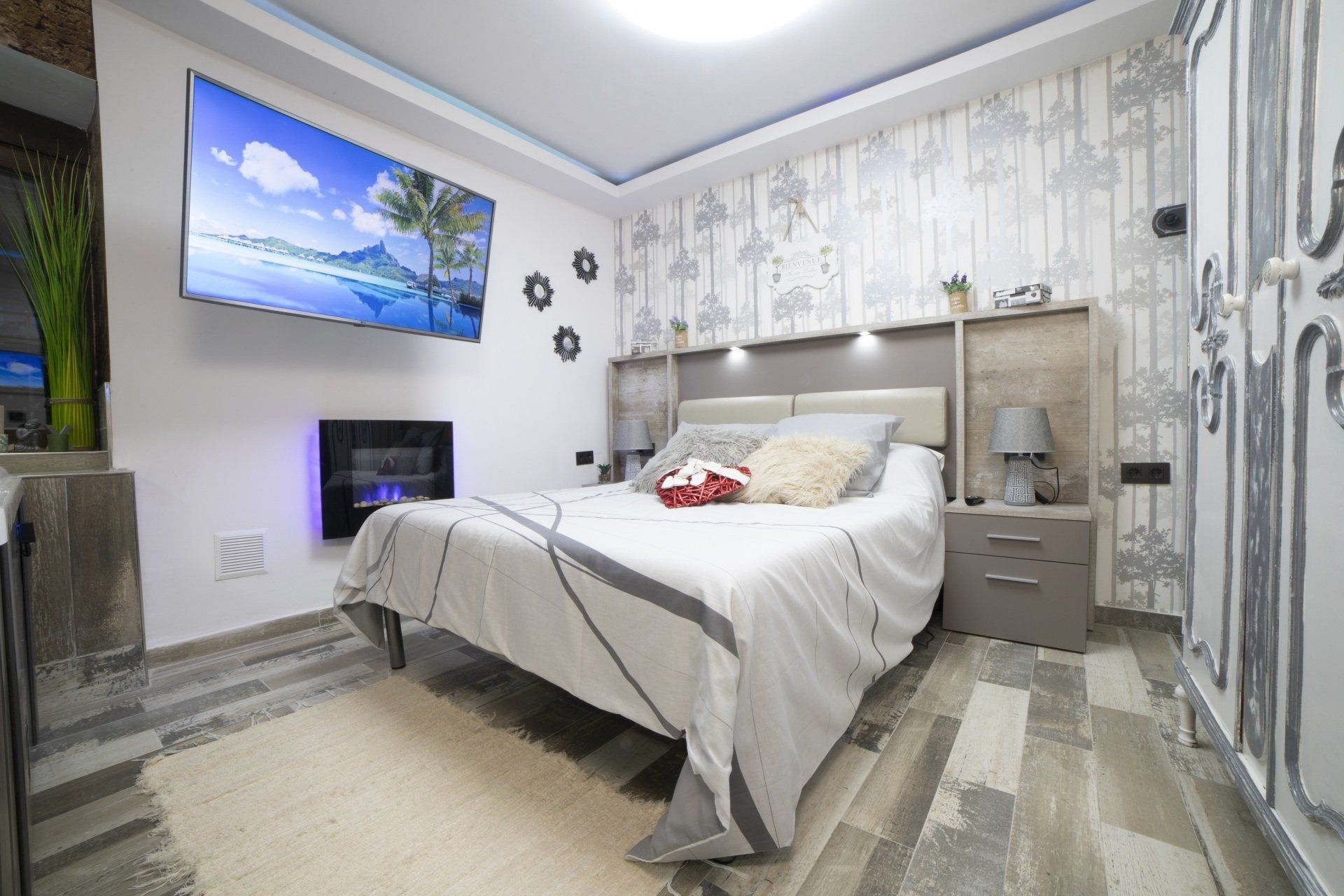 Este apartamento también dispone de un jacuzzi spa frente a la cama y con una tele de 55 pulgadas.